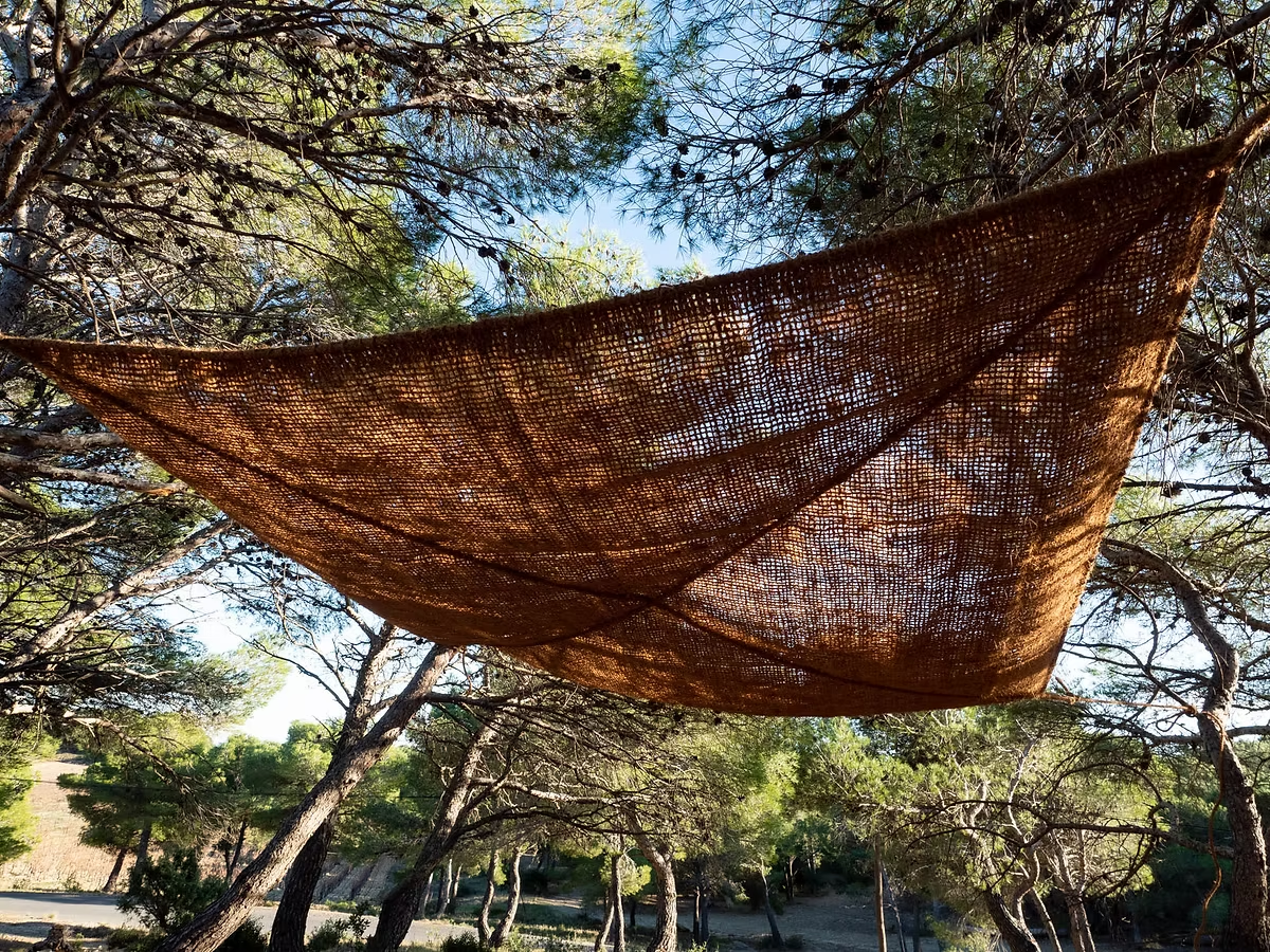 Voile d’ombrage Modèle B : Tissage simple à suspendre , renforcé avec des cordes croisées en diagonale et fixé avec 4 points d’attache à chaque angle. Les cordes croisées en diagonale se trouvent sous la voile d’ombrage pour un meilleur maintien. Il faut prévoir 4 cosses cœur et de la corde pour les angles.